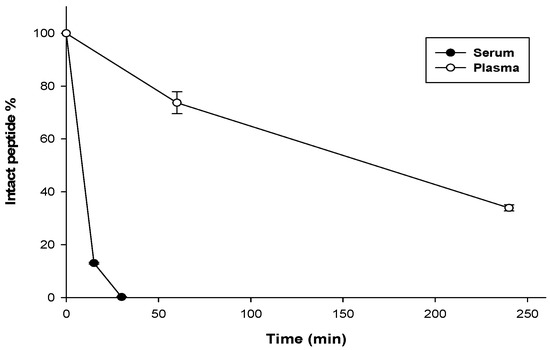 On the other hand, regarding the serum stability test, UP-5 was studied in full mouse serum at different time points (Figure 3). As reported, more than 80% of the initial peptide amount was degraded after 15 min and after 30 min, the peptide was totally degraded. These results indicate that UP-5 is more stable in plasma (t1/2 = 173 min = 2.9 h) than in serum (t1/2 < 15 min). This data indicates that the peptide suffers from high in vivo degradation and poor stability which would consequently limit the application of this peptide for topical antimicrobial therapy.