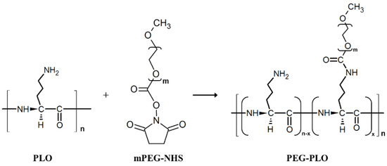 Synthesis scheme of polyethylene glycol modified poly-l-ornithine (PEG-PLO) using N-hydroxysuccinimide (mPEG-NHS). PLO and mPEG-NHS were mixed in a 1:10 molar ratio. The mixture was stirred overnight at room temperature (r.t.).