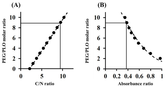Determination of PEG/PLO molar ratio of PEG-PLO by elemental analysis (A); and TNBS (2,4,6-Trinitrobenzenesulfonic acid) assay (B). ●: theoretical value; ----: regression line.