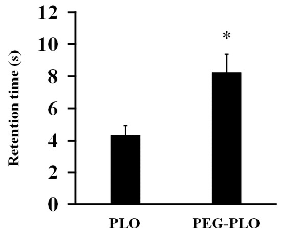 Retention time of PEG-PLO solutions in the in vitro inclined plate test. Retention time was defined as the time required for the solution to flow 3 cm. All measurements were performed at r.t. on the same day. Each data column represents the mean ± S.E. (n = 6), * p < 0.05 compared with the PLO.