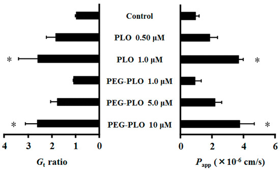 Each Gt (membrane conductance) was expressed in the ratio of 120 to 0 min values because the permeation-enhancing effects of HPBAAs were considered to have reached a steady state [7,11]. Gt and the apparent permeability coefficient (Papp) of fluorescein isothiocyanate dextran (FD-4, MW 3.4 kDa) in Caco-2 cells increased dose-dependently by application of PLO and PEG-PLO. Interestingly, the Gt and Papp of FD-4 after application of 1.0 μM PLO and 10 μM PEG-PLO were almost the same (Figure 5). The titer of the permeation-enhancing effect of PEG-PLO was 1/10 as compared with unmodified-PLO.