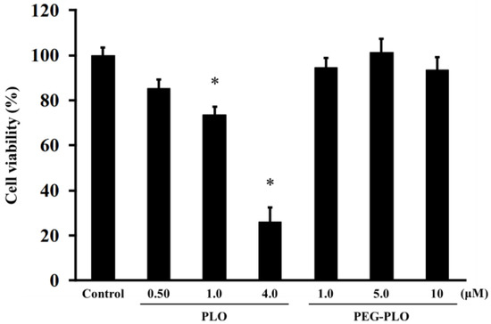 Effects of PLO and PEG-PLO on cell viability in Caco-2 cells. Control group was treated with vehicle (Hank’s balanced salt solution (HBSS)). Each data column represents the mean ± S.E. (n = 3–4). * p < 0.05 compared with the control group.