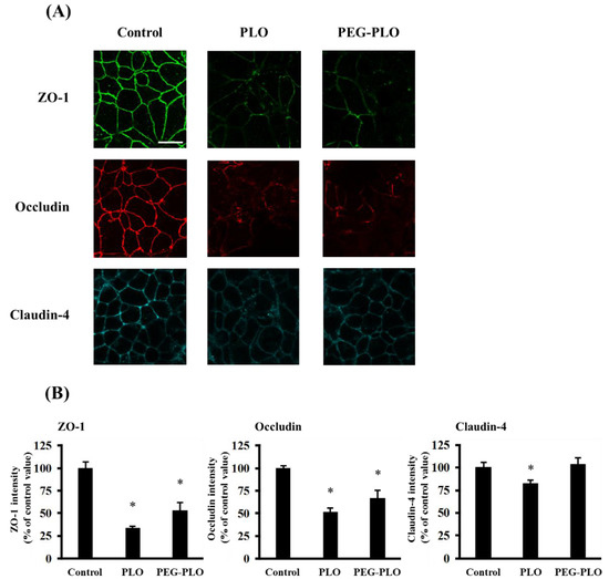 The distribution of TJ proteins, zonnula occludens-1 (ZO-1), occludin and claudin-4, was visualized by immunofluorescent staining after application of PLO (1.0 μM) and PEG-PLO (10 μM). Fluorescence images and intensity at the paracellular space of each protein are shown in Figure 7A,B, respectively. The intensities of TJ proteins decreased by application of PLO (the percentages of intensity of ZO-1, occludin and claudin-4 to the intensity in the control group were 33.5%, 52.0% and 82.1%, respectively). Application of PEG-PLO decreased the intensities of ZO-1 and occludin (53.0% and 67.0% to control, respectively), but the intensity of claudin-4 was maintained at a similar level in the control group.