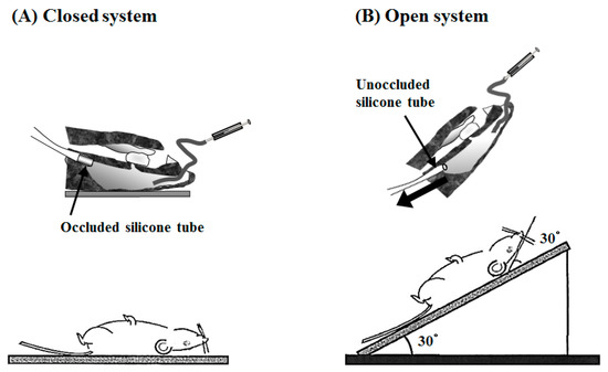 The i.n. administration study was carried out using an “in vivo intranasal retentivity evaluation system”, i.e., closed and open systems [14]. The rats anesthetized as described above were treated surgically using a previously reported method [27]. A cannula was inserted into the trachea to maintain respiration. In the closed system, an occluded silicone tube was inserted in the esophagus direction of the pharynx to prevent the dosage formulation from leaking to the esophagus side (Figure 8A). In contrast, in order to allow the administered solution to leak from the nasal cavity to the pharynx side in the open system, an unoccluded silicone tube was inserted in the esophagus (Figure 8B). The nasopalatine duct was sealed with medical adhesive to prevent any test solution from leaking into the buccal cavity. The FD-4 solution for i.n. administration (33 mg/kg in 0.4 mL/kg) was administered at a distance of 8 mm from the entrance of the left nostril using a microsyringe having a polyethylene tube (diameter: inner 0.5 mm, outer 1.0 mm) attached to the tip. In the open system, the neck and body of the rats were inclined by 30 degrees (total 60 degrees) 10 s after administration in order to allow leakage of dosage formulation from the nasal cavity to the pharynx. Blood samples (0.15 mL) were collected from the right jugular vein using a heparinized syringe and needle at predetermined times after administration, and plasma samples were obtained by centrifugation (15,000 rpm, 4 °C, 5 min, rotation radius: 71 mm). The fluorescence intensity of plasma FD-4 in plasma was measured as mentioned in Section 4.8.