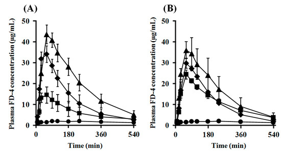 The intranasal (i.n.) administration experiments were performed using PLO and PEG-PLO in an “in vivo intranasal retentivity evaluation system”, i.e., closed and open systems (Figure 8A,B, respectively) [15], under various conditions. Transitions of plasma concentration and pharmacokinetic parameters of FD-4 after i.n. administration with PLO and PEG-PLO at various concentrations in the closed system, in which the dosage formulation could not leak to the esophagus side (Figure 8A), are shown in Figure 9 and Table 3, respectively. In the FD-4 alone administration group, plasma FD-4 concentration did not increase (black circle in Figure 9A,B). In contrast, in the co-administration groups with PLO and PEG-PLO, transitions of plasma FD-4 concentration increased (Figure 9A,B) and The maximum plasma FD-4 concentration (Cmax), AUC from 0 to 540 min (AUC0–540) and F0–540 showed dose-dependent higher values of the enhancers (Table 3). At the same concentration (0.50%), F0–540 was 71.6% in PLO, in comparison with 40.4% in PEG-PLO. PLO exhibited a significant increase in AUC0–540 at 0.25% (approximately 55.7 μM calculated from Table 2); however, PEG-PLO showed almost the same degree of absorption-enhancing effect at 1.00% (approximately 87.0 μM calculated from Table 2). The titer of absorption-enhancing effect was not decreased as much as seen in vitro.