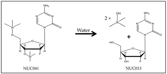 Hydrolysis of NUC041 to NUC013 with release of TMS.