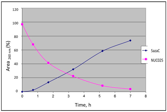 Initial feasibility studies were performed with the TMS prodrug of 5-azaC for ease of synthesis (NUC025, 2′,3′,5′-tri-trimethylsilyl-5-azacytidine). Using a spectrophotometer, absorbance was measured at 260 nm and percent area of time 0 calculated and thereafter fractions thereof. At 20 °C in saline, NUC025 efficiently released 5-azaC by hydrolysis (Figure 2).