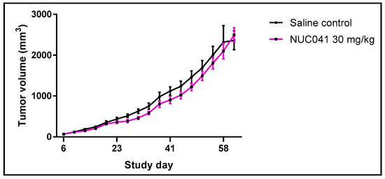 Mice with tumors in the proper volume range were arbitrarily assigned to groups. Mice received test article as described in the text. Mice were observed daily for mortality and moribundity with weights and the tumor measurements taken twice weekly. Tumor volume was determined using the formula for an ellipsoid sphere: Length × Width2/2 = Volume (mm3). The experiments were scheduled to last 60 days from the day of tumor implant. Any animal whose weight decreased more than 30% from the weight on the first day of treatment or whose tumor reached 4000 mm3 in volume, ulcerated, sloughed off, or was moribund was euthanized prior to study termination. Per protocol amendment, two mice in the NUC041 0.6 mg group continued to receive treatment for four days following ulceration before euthanasia.