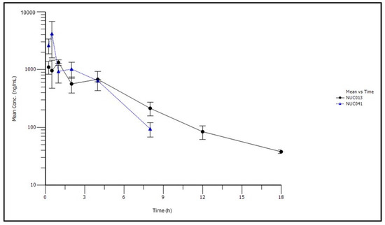 For the study of NUC041 formulated in LNE, blood was collected at 3, 6, 15, 30, 45, 60, 120, and 240 min. For the study of NUC041 formulated in PPD, blood was collected at 0.25, 0.5, 1, 2, 4, 8, 12, and 18 h. Pharmacokinetic parameters were calculated from mean concentrations of NUC-041 or NUC013 in blood over time for mice using Phoenix® WinNonlin® (Version 6.3; Pharsight, A Certara Company; Cary, NC, USA).