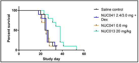 As per Figure 5, mice treated with NUC013 20 mg/kg IV for three consecutive days a week for four weeks had significantly improved survival vs. SC. Median survival of SC mice was 25.5 days vs. 38 days for mice treated with NUC013 (hazard ratio (HR) = 0.14, p = 0.0018). However, no survival benefit was noted for mice treated with NUC041 with or without dexamethasone pretreatment. This lack of survival benefit was related to per protocol euthanasia of mice with ulcerated tumors. The last surviving mouse in the NUC041 with dexamethasone group was euthanized on day 35 for histology as was the last surviving mouse in the NUC041 0.6 mg group on day 34.