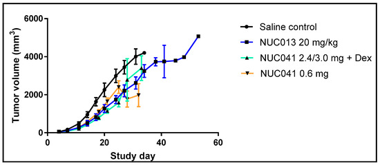 As per Figure 6, mice treated with NUC013 had significantly lower tumor volumes vs. SC on study days 14 through 27 (p < 0.05, Student t-test, 2-tailed). Mice with NUC041 with dexamethasone pretreatment had significantly lower tumor volumes vs. SC on study days 7 through 25, while mice in the NUC041 0.6 mg group had significantly lower tumor volumes vs. SC on study days 11 through 18 and again on day 28 (both, p < 0.05, Student t-test, 2-tailed). The dip in tumor volumes on study day 28 in the NUC041 0.6 mg group was partially related to tumor regression noted in two mice. One mouse had regression in tumor volume from day 25 to 32 of 38% and the other of 51%.
