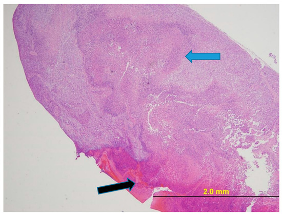 NCI-H460 human NSCLC xenograft (Mouse 3 with ulcerated 1960 mm3 tumor). H&E stain. The tumor had foci of necrosis consisting of necrotic neoplastic epithelial cells and degenerate and karyorrhectic neutrophils (blue arrow). The surface of the tumor was ulcerated (black arrow). At the margin of the neoplasm, within a band of fibrous connective tissue, neutrophils were admixed with several lymphocytes and plasma cells.