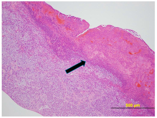 NCI-H460 human NSCLC xenograft (Mouse 4 with ulcerated 936 mm3 tumor). H&E stain. The tumor had an ulcerated surface with karyorrhectic neutrophilic debris, eosinophilic debris, hemorrhage, keratin, and necrotic neoplastic cells within the site of ulceration (black arrow).
