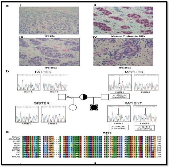 Genetic characterization and testis histology of the 46, XY disorder of sexual development (DSD) patient with a female phenotype. (a) Histopathologic studies revealed that both gonads consisted of atrophic and immature seminiferous tubules which were filled almost exclusively with pre-Sertoli cells. The fertility index was 5% with abortive and fetal type spermatogonia (i–iv); iii. in some areas, the tubules formed lobule-like structures similar to pseudo-hamartomas surrounded by collagen fibrous tissue; iv. nests of fibroblastic pre-Leydig cells were found in the interstitium. Albuginea and epidydimus were unremarkable. H/E-hematoxylin-eosin stain. (b) Family tree and electropherograms showing the index patient, the parents and the half-sister. Both, the patient and mother harbored the heterozygote c.1096G > A (p.Val366Met) mutation in exon 6, while the heterozygote c.1321T > C (p.Ser441Pro) mutation in exon 8 was only present in the patient. The father and the half-sister were both non-carriers of either mutation. (c) Alignment of human CYP17A1 amino acid sequence with a range of CYP17A1 proteins from other species found in the Universal Protein Knowledgebase (UniProt) database. The Valine 366 residue is highly conserved in all species studied.