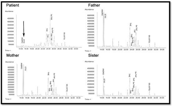 Urine steroid profile of the patient, heterozygote mother, father, and sister. The steroid analysis was performed on 24 h urine samples by GC/MS. Note the lack of androgens (ETIO, ANDRO) and the relative increase in corticosterone metabolites (THA, THB, 5α-THB) in the steroid profile of the patient compared to mother and father. THA—tetrahydro-11-dehydrocorticosterone; THB—tetrahydro corticosterone; 5a-THB-5α-tetrahydro corticosterone; THE—tetrahydrocortisone; THF—tetrahydrocortisol; 5a-THF-5α-tetrahydrocortisol; ETIO—etiocholanolone; ANDRO—androsterone; SS (ISTD)—internal standard.