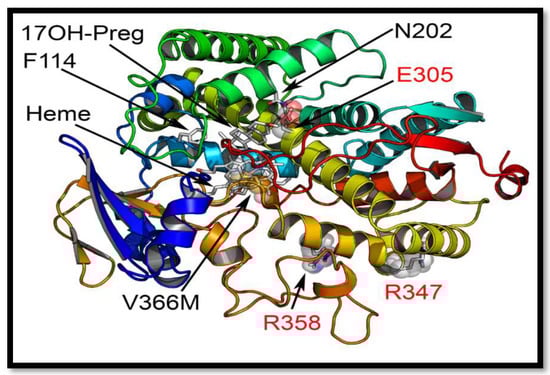 Lack of 17α-hydroxylase activity of CYP17A1 results in a compensatory overproduction of corticosterone and deoxycorticosterone with a weak glucocorticoid and significant mineralocorticoid action, which results in severe hypertension and hypokalemia. On the other hand, the 17,20 lyase deficiency results in a lack of sex steroids, leading to the 46, XY disorder of sexual development (DSD) with severe undervirilization in the “male” newborn, and deficient pubertal development and fertility in both sexes [4]. Previously, we have reported that disturbing the interaction of CYP17A1 with P450 oxidoreductase (POR) for electron transfer causes combined 17α-hydroxylase and 17,20 lyase deficiency [2,14,16,31,32,33,34]. Mutations identified on the surface of CYP17A1 (R347C/H, R358Q) have been proposed to diminish the interaction with POR but could not explain the mechanism of their specific effect on 17,20 lyase activity [27,35].