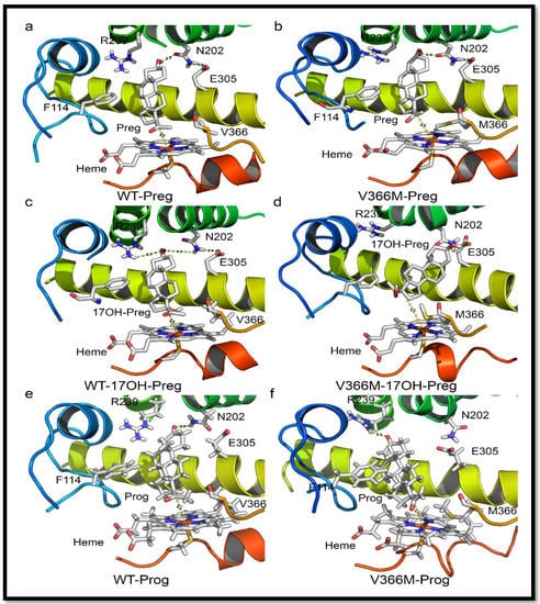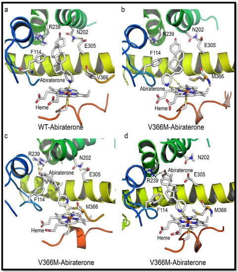In addition, we also observed shorter distances suitable for hydrogen bonds with N202 and R239 groups and 17OH-PREG in the docking poses of V366M mutant (2.6 Å compared to 4.4 Å for the WT) (Figure 7d and Figure S2, Table 6); it has been proposed that these interactions are required for PROG/PREG but are considered suboptimal for 17,20 lyase reaction and are found together with increased distances of C17 in 17α-hydroxy steroid substrate and the heme iron. Increased distances between the C17 of 17OH-PREG/Abiraterone and the heme iron, together with the extra/undesired interactions with N202/R239, were consistently observed in our simulations (Figure 7c, Figure 8, Figures S1 and S2).