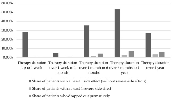 An increase in the occurrence of events with the increasing duration of the therapy was shown for severe side effects (see Figure 2). The share of patients affected increased from 0.6% (up to one week) to 3.5% (more than one year). The share of patients with at least one side effect (without severe side effects) was in a range between 4.7% (duration of therapy over one week to one month) and 53.3% (duration of therapy over six months to one year) during the therapy periods considered. The share of these patients in the periods considered were the lowest for a duration of therapy over one week to one month (4.7%) and over one year (26.9%). The share of patients who dropped out of the study prematurely due to side effects increased from 0.9% (duration of therapy up to 1 week) to 6.4% (duration of therapy of more than one year).