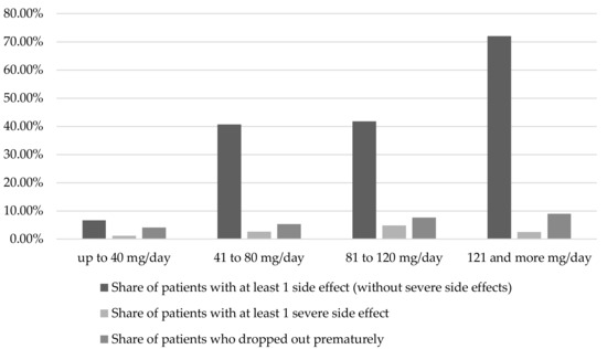 Studies indicated an increase in adverse events in patients over 65 years of age [21,57]. The share of patients who experienced at least one side effect (without severe side effects) and one severe side effect was twice as high in the group of patients over the age of 65 (58.3% and 6.3%) than in the group of patients under 65 years (29.2% and 2.5%) [57]. The number of comorbidities in the study population of the patients under 65 years was in part only half as high as in the group of patients over 65 [57]. In the younger group every patient took an average of 3.8 medications versus 7.1 medications in the older patient group [57].