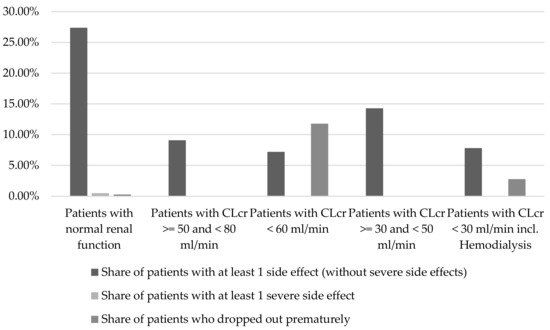 Occurrence of adverse events depending on renal function (n (patients with normal renal function) = 1812; n (patients with CLcr >= 50 and <80 mL/min) = 11; n (patients with CLcr <60 mL/min) = 610; n (patients with CLcr >=30 and <50 mL/min) = 35; n (patients with CLcr <30 mL/min incl. hemodialysis) = 399; per patient group (sorted by renal function, left starting with the best) differentiation between patients with at least one side effect (column 1), patients with at least one severe side effect (column 2), patients who dropped out prematurely (column 3)) [12,13,14,17,18,19,20,22,24,25,26,29,31,34,35,37,38,41,44,45,46,48,49,50,51,52,55].