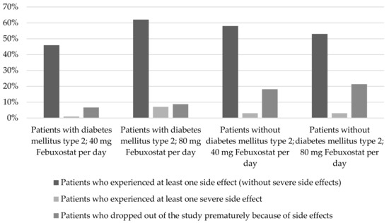 In Ito et al. [39], at least one side effect (without severe side effects) occurred among 13.5% of the diabetes patients treated with febuxostat. Among patients without diabetes mellitus type 2 the share was 20% [39].
