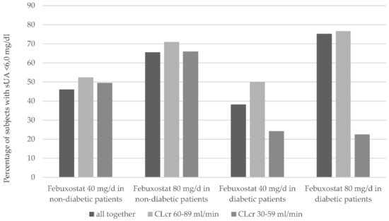 Becker et al. [56] showed that the urate lowering efficiency of febuxostat (reducing the serum urate level below 6 mg/dL) is dose dependent in both patients with and without renal insufficiency. Febuxostat at a daily dose of 80 mg was more efficient than 40 mg at any level of renal insufficiency (see Figure 6). This holds true for both diabetic and non-diabetic patients [56].