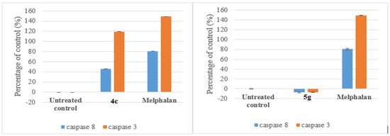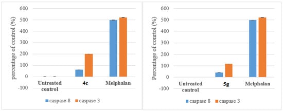 Caspase 8 and 3 activation as indicated by % changes in the mean integrated fluorescence intensity of the untreated control using HeLa cells after 24 h of exposure to compounds 4c and 5g (IC50 values) using Melphalan as a positive control. Bar graph represents the average of one individual experiment performed in quadruplicate. The standard deviations are represented as error bars.