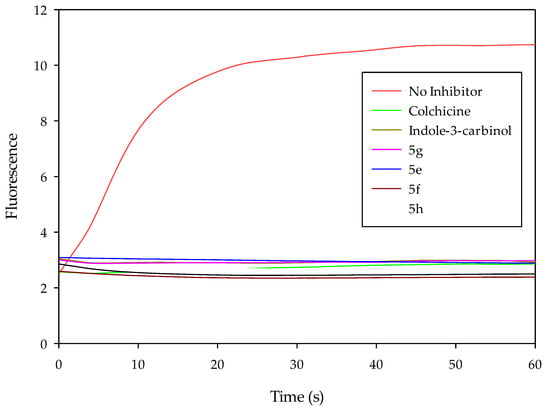 Kinetics of inhibition of tubulin polymerization by 5e–h at 0.25 µM against colchicine (green) and indole-3-carbinol (yellow) and in the absence of an inhibitor (red). Fluorescence at 450 nm was measured every three seconds over a period of 1 h at 37 °C.