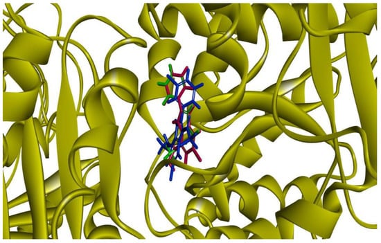 Compounds 2a (green), 4a (pink) and 5g (blue) were docked at the interface of a tubulin heterodimer (PDB code: 1TUB), which is coloured yellow.