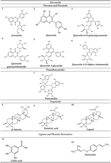 Phytochemical analyses of the leaves of C. americana L. already published, revealed the presence of phenolic compounds, flavonoids, terpenes, saponins and steroids according to studies performed by El-Azizi et al. and Gurni and Kubitzki [,], that identified the following compounds: (1) Avicularin; (2) Quercetin; (3) Quercetin-3-O-galactopyranoside; (4) Quercetin galactoarabinoside; (5) Quercetin-3-glucoside; (6) Quercetin-3-O-Alpha-l-rhamnoside; (7) Procyanidin; (8) β-Amyrin; (9) Betulinic acid; (10) Lupeol; (11) gallic acid; (12) Foeniculin (see Figure 1). The identified molecules were used in the molecular modeling study.