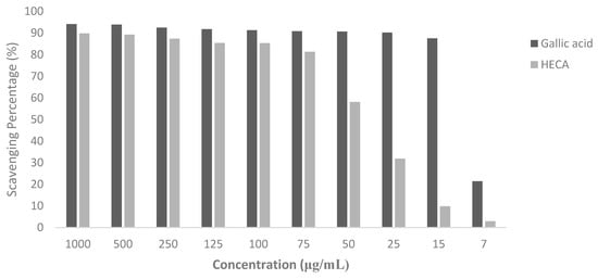 Briefly, the reaction mixture solution consisted of 2.7 mL of DPPH solutions (40 μg/mL) in methanol and 300 μL of HECA (103 to 7.0 μg/mL) that was mixed thoroughly and incubating in darkness. After 30 min, the decline of radical concentration was measured by spectrophotometry visible at 517 nm using Biospectro SP-22. The experiment was performed in triplicate, and the mean absorption was analyzed for each concentration. Methanol was taken as the control, and the gallic acid (Sigma-Aldrich®, Missouri EUA, MO, USA) in the same concentrations of the extract was taken as the reference standard compound. The percentage of antioxidant activity was calculated according to Cefali et al. [].