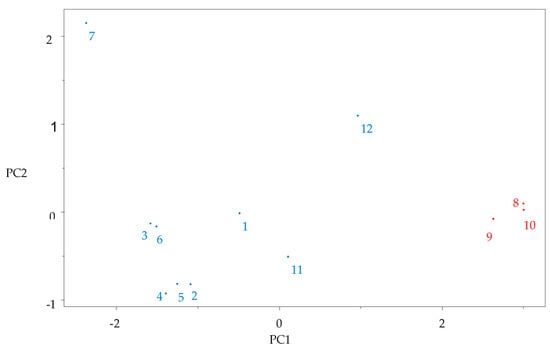 The plot of PC1–PC2 scores for Curatella americana chemical constituents. Red color indicates less reactive compounds and blue color indicate more reactive compounds.