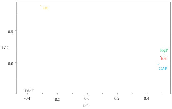 The plot of the PC1–PC2 loadings with the five descriptors selected.
