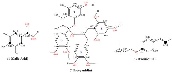 Antioxidant activity is highly related to the electron donation capacity. The hydrogen transfer step has been highlighted, but the antioxidant activity does not only depend on the energy strength of the O–H bond. The stabilization of the cation-radical and radical species formed should also be considered [,,]. Therefore, we evaluated via ionization potential value (IP) and spin density compounds 7 (procyanidin), 11 (gallic acid) and 12 (foeniculin). Glycosylated flavonoids were disregarded because they had lower antioxidant activity than their free aglycones [,] and terpenoids because they had lower HOMO values and in the PCA analysis were grouped separately from the known antioxidant compounds. Procyanidin and foeniculin presented high HOMO values besides low Gap values, showing low molecular stability and high chemical reactivity.