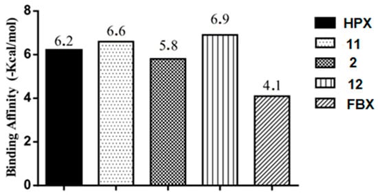 The evaluation of affinity showed that foeniculin (compound 12) has a higher binding affinity (−6.9 Kcal/mol) in relation to the studied compounds and that it had a variation ±0.7 Kcal/mol in comparison to the HPX, and the other structure with better affinity, gallic acid (compound 11), had a variation of ±0.4 Kcal/mol, see Figure 8.