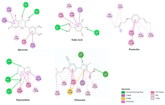 We can also observe higher interaction numbers of febuxostat, which is a potent inhibitor of the enzyme xanthine oxidase. We found similar interactions with those published by Okamoto et al. [], except for the interaction with the Ser876, Ala1078, and Ala1079. The interaction Ala1079 was found in all compounds selected, but the Ser876 only was found in the febuxostat and quercetin (compound 2). Figure 9 shows the interactions for the docked structures that had the best affinities. Amino acids residues, quantitative data of distances and binding free energies (ΔG) between the compounds and XO receptor are shown in Table 3.