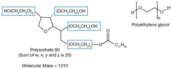 To quantify excipient and derivative PEG, we included free excipient PEG of various molecular weights and derivatives with chemical structures containing PEG chains (PS20, PS80, and P188). The proportion of PEG within the chemical structure was calculated. For example, PS80 (MW 1310 g/mol) [27] is a combined molecule of three parts: oleic acid (MW 282.47 g/mol), sorbitol (MW 182.17 g/mol), and PEG (1310 − 282.47 − 182.17 = 845.36 g/mol) (Figure 1). Therefore, PEG comprised 64.5% of PS80.
