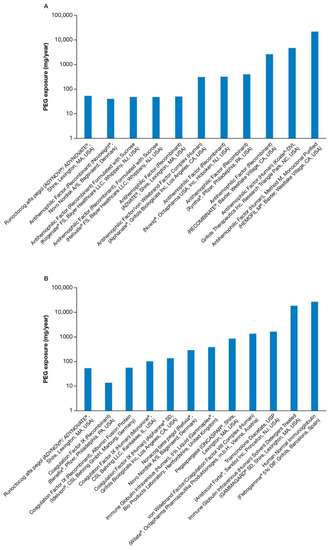 Several therapies with PEG were not included in the analysis due to inadequate information to perform the calculations. For PEGylated therapies, in order to calculate PEG amounts in a dose and per year, it was necessary to obtain information on the pediatric therapeutic dose, conjugate PEG molecular weight, total molecular weight of the biological, and the specific activity. For therapies with excipient or derivative PEG, it was necessary to have information on the pediatric dose, concentration of PEG per vial, and the ratio of PEG molecular weight to derivative molecular weight. We were unable to locate the amount of polysorbate 20 in antihemophilic factor (recombinant) or Fc fusion protein (Eloctate®, Bioverativ Therapeutics Inc., Waltham, MA, USA), and thus exposure calculations were not performed. Other medications for which we were unable to calculate exposures include: Immune Globulin Injection (Human), 10% Caprylate/Chromatography Purified (Gamunex-C®, Grifols Therapeutics Inc., Research Triangle Park, NC, USA), Immune Globulin Intravenous (Human), 10% Liquid (Privigen®, CSL Behring LLC, Kankakee, IL, USA), Immune Globulin Intravenous (Human) (Carimune®, CSL Behring LLC, Kankakee, IL, USA), Immune Globulin Injection (Human) 10% Caprylate/Chromatography Purified (Gammaked®, Grifols Therapeutics Inc., Research Triangle Park, NC, USA) and amiodarone hydrochloride (Cordarone X®, Sanofi-Aventis Australia, Macquarie Park, NSW, Australia).