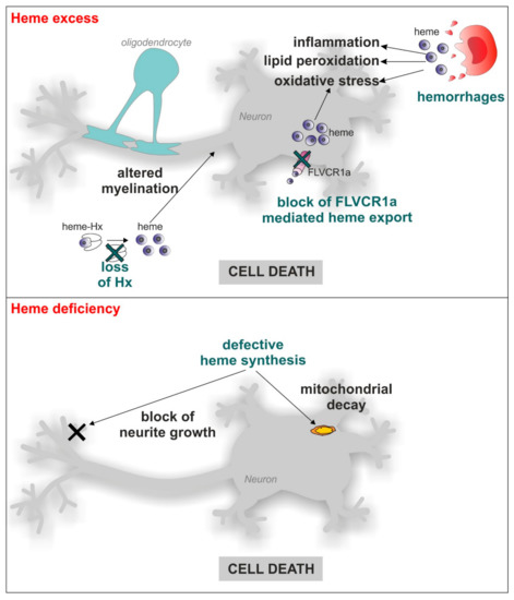 Implication of heme in neurodegeneration. Both heme excess and heme deficiency contribute to neurodegeneration. Heme released during hemorrhages leads to inflammation, lipid peroxidation and oxidative stress; the loss of the heme scavenger Hx causes defective myelination of axons; the impairment of intracellular heme export by FLVCR1a is associated with increased oxidative stress. On the other hand, heme deficiency, due to defective synthesis, leads to mitochondrial decay and the blocking of neurite growth. These events all result in neuronal cell death. In the figure, neurons are represented as the main target for heme-mediated effects; however, other cell types of the nervous system could be affected by the same phenomena.