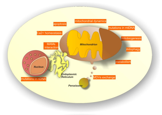 Mitochondrial dependent mechanisms in neurodegeneration. Mitochondria contribute to neurodegeneration by several mechanisms, including alterations in calcium homeostasis, mitochondrial biogenesis (mitobiogenesis), mitochondrial dynamics, metabolism and mitophagy. Moreover, mutations in mitochondrial DNA (mtDNA) and inappropriate activation of apoptosis can be alternative mechanisms. Finally, additional systems include mutations in nuclear DNA (nDNA) at the level of genes encoding for mitochondrial proteins, the compromised exchange of mitochondria-derived vesicles (MDVs) among mitochondria and peroxisomes and the inefficient interaction among mitochondria and the endoplasmic reticulum at the level of mitochondrial associated membranes (MAMs).