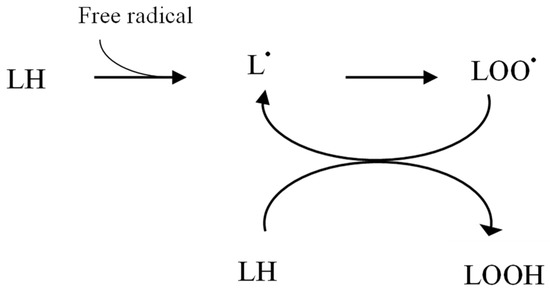 Reactive oxygen species (ROS)-induced lipid peroxidation. LH (lipid), LOOH (peroxide lipid), L• (lipid radical), LOO• (peroxidised lipid radical).