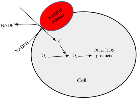 Schematic representation of NADPH oxidase-dependant ROS generation. NADPH under the influence of the plasma membrane-bound NADPH oxidase donates an electron, which is accepted by molecular oxygen to form the superoxide (O2•) radical.