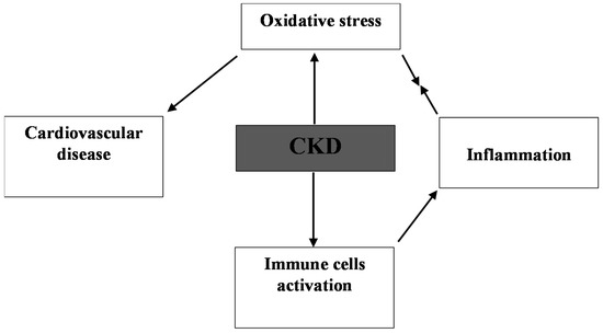 Patients with CKD are in a constant inflammatory state attributable to a number of factors, including the uraemic state, malnutrition, chronic volume overload, increased infection, metabolic acidosis, and autonomic dysfunction [37,38]. Inflammatory cells (e.g., phagocytes, monocytes/macrophages, or polymorphonuclear leukocytes) release reactive substances such as O2• at the site of inflammation causing oxidative stress and ROS that, in turn, can initiate intracellular signalling cascade that activates pro-inflammatory gene expression [39]. For example, an increase in ROS is associated with the induction of inflammation, consequently increasing the levels of mediators such as interleukin-6 (IL-6) and tumour necrosis factor β (TGF-β) [40]. Thus, inflammation and oxidative stress in CKD are interlinked, with synergy between them magnifying the deleterious consequences associated with either of them alone (see Figure 3). Elevated concentrations of the pro-inflammatory markers C-reactive protein (CRP) and IL-6 significantly correlated with protein carbonyl (caused by oxidative damage to proteins) levels in early CKD [41]. The upregulation of inflammatory markers (e.g., tumour necrosis factor-α and platelet-derived growth factor) in CKD [42] are linked to NADPH oxidase activation leading to the generation of intracellular O2• and H2O2 [43]. The inflammatory state in CKD can lead to activation/recruitment of polymorphonuclear neutrophils and monocytes, causing the activation of myeloperoxidase (MPO) and triggering ROS production [44].
