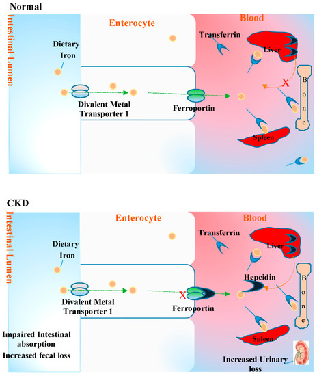 Iron deficiency anaemia (IDA), a common complication in many chronic diseases including CKD, is caused by iron and erythropoietin deficiencies and a decreased responsiveness to the actions of erythropoietin [57,58]. Iron deficiency (ID) in CKD can be grouped into absolute and functional deficiency. Absolute iron deficiency in this patient group can be caused by low iron intake and complicated by impairment of dietary iron absorption in the gut, gastrointestinal bleeding, and increased blood loss [59]. Functional iron deficiency, on the other hand, is mediated by pro-inflammatory activation and hepcidin overproduction [60,61]. Hepcidin, which is produced by the liver, binds to and induces the degradation of ferroportin on hepatocytes, duodenal enterocytes, and reticuloendothelial macrophages, thereby inhibiting the absorption of dietary iron in the intestines and the release of iron from storage [62]. Hepcidin is also regulated transcriptionally by the inflammatory mediator IL-6 (known to be increased in CKD) via the STAT-3 signalling pathway [63,64]. Thus, enhanced inflammation in patients with CKD induces hepcidin production, causing iron sequestration and hypoferraemia and resulting in ID anaemia (see Figure 4) and oxidative stress [65].