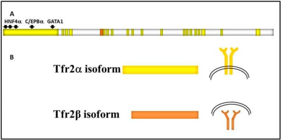 It is encoded by TFR2, a 2471 bp long gene localized on the long arm of human chromosome 7 (7q22.1) that consists of 18 exons, and gives origin to two main variants regulated by different specific promoters: Tfr2α and Tfr2β (Figure 1).
