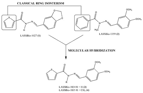 Design concept of N-acylhydrazone derivatives LASSBio-1834 (3) and LASSBio-1835 (4).