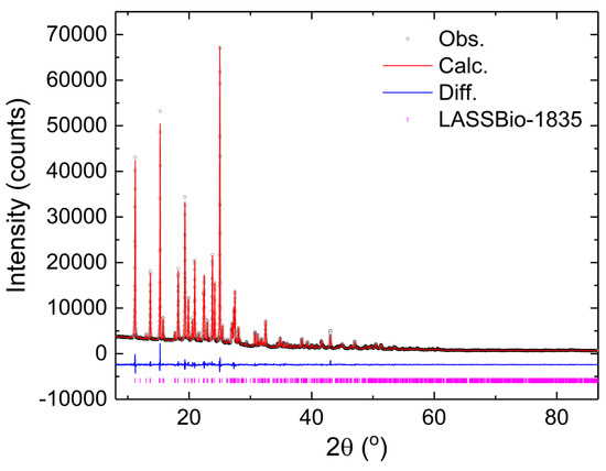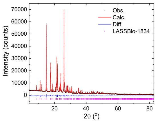 Plot from the final Rietveld refinement of LASSBio-1835 (4). Black circles represent observed data; the red line indicates the calculated pattern and the blue line at the bottom represents the difference between the observed and calculated patterns. Magenta vertical bars indicate the Bragg reflections.