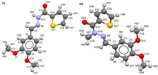 As previously described by our research group, the condensation between hydrazides and aldehydes preferentially produces N-acylhydrazones with a relative (E) configuration [4,15,16,17]. In agreement with this behavior, the analysis of 1H and 13C NMR spectra of 2-thienyl-N-acylhydrazones (3) and (4) indicated they were obtained as a single diastereoisomer, which X-ray diffraction studies confirmed to present the relative configuration (E), as will be discussed next.