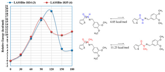 CAM-B3LYP/6-31G(d) potential energy surfaces of the O=C-N-X dihedral angle for LASSBio-1834 (3) and LASSBio-1835 (4), obtained with the SPARTAN’16 software (Wavefunction, Inc.).