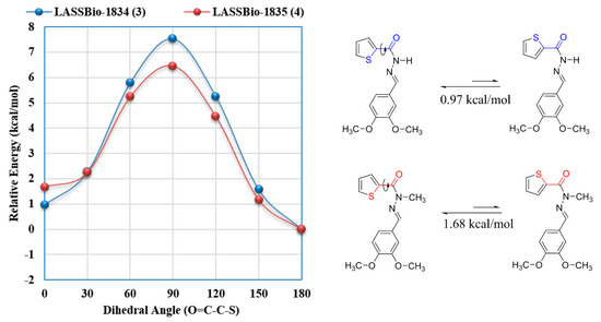 CAM-B3LYP/6-31G(d) potential energy surfaces of the O=C-C-S dihedral angle for LASSBio-1834 (3) and LASSBio-1835 (4), obtained with the SPARTAN’16 software (Wavefunction, Inc., Irvine, CA, USA).
